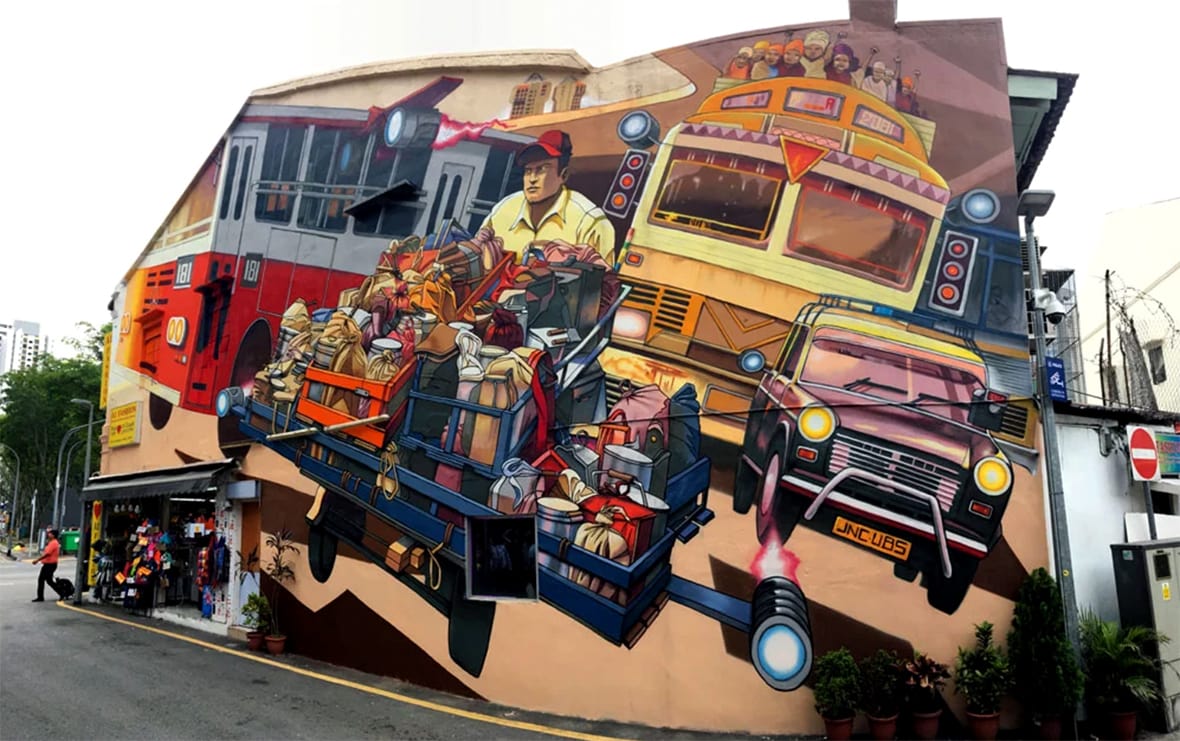 A tribute to the delivery drivers that brave the traffic on their carts to deliver fresh ingredients and food to the restaurants and people of Little India, this mural contains a fictional narrative of the future in Little India. The man carrying tiffins, or stacked metal containers with food, pedals a cart that is really a hovercraft in disguise. In fact, all the antiquated vehicles hover above the ground, in a juxtaposition of tradition and modernism in Little India. If you look closely, you can make out that the wheels of the cart are also equipped with turbo-engines!